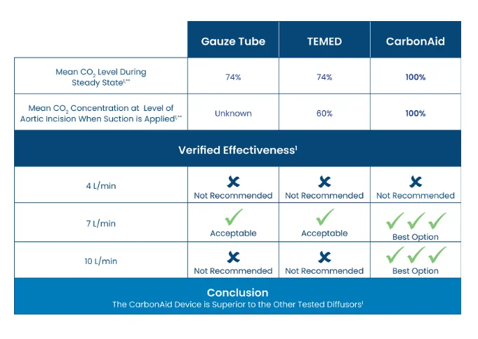 A robust, independent clinical study comparing CO2 field flooding devices, including CarbonAid and other commercial and improvised deairing devices, concluded that the CarbonAid device is superior to other devices or methods.1,*,**