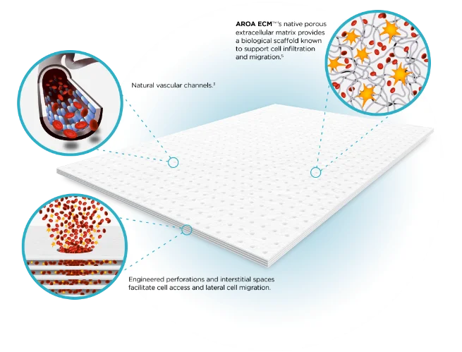 Myriad Matrix™ devices contain the natural porous structure of AROA ECM™, engineered with interstitial perforations to enable cell infiltration to facilitate rapid healing.