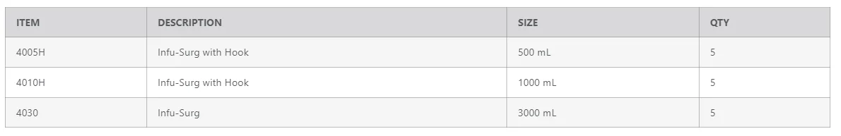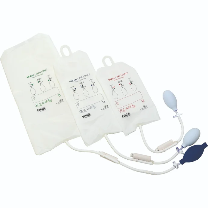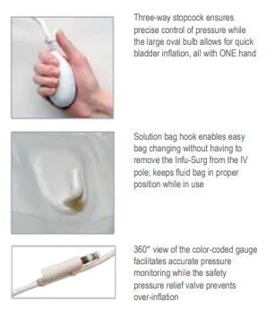 The latex free Infu-Surg Pressure Infusion Bag is a safe, high-quality, reliable device for intravenous and intra-arterial infusion treatment including A-line pressure monitoring. The new dedicated fluid bag hook enables efficient loading and unloading of the system without having to remove the infusion bag from the IV pole. Designed for single patient use, the Infu-Surg may help prevent and control cross-contamination and hospital acquired infections. The Infu-Surg is a cost-effective, trusted product that medical professionals have relied on for decades.